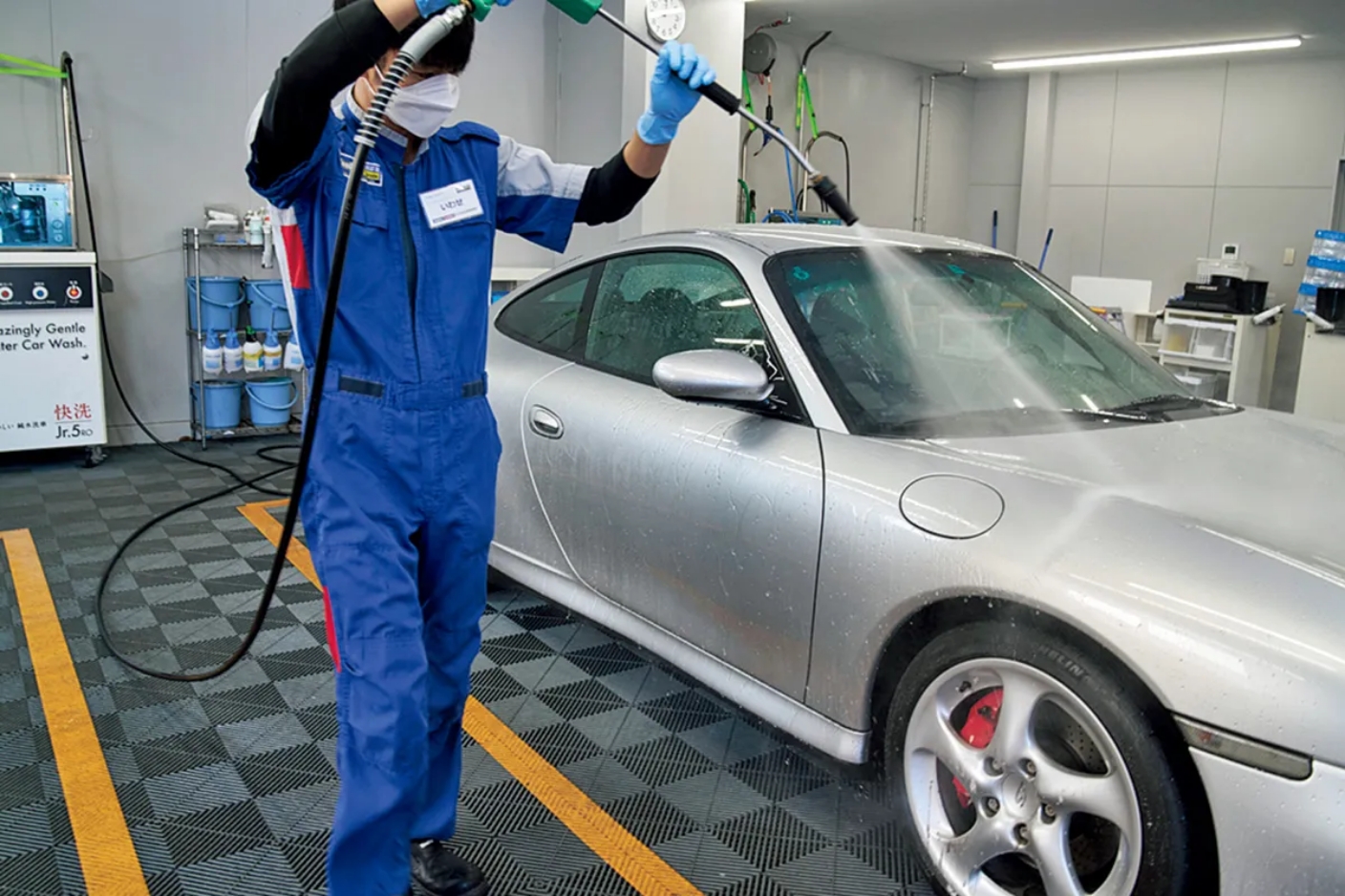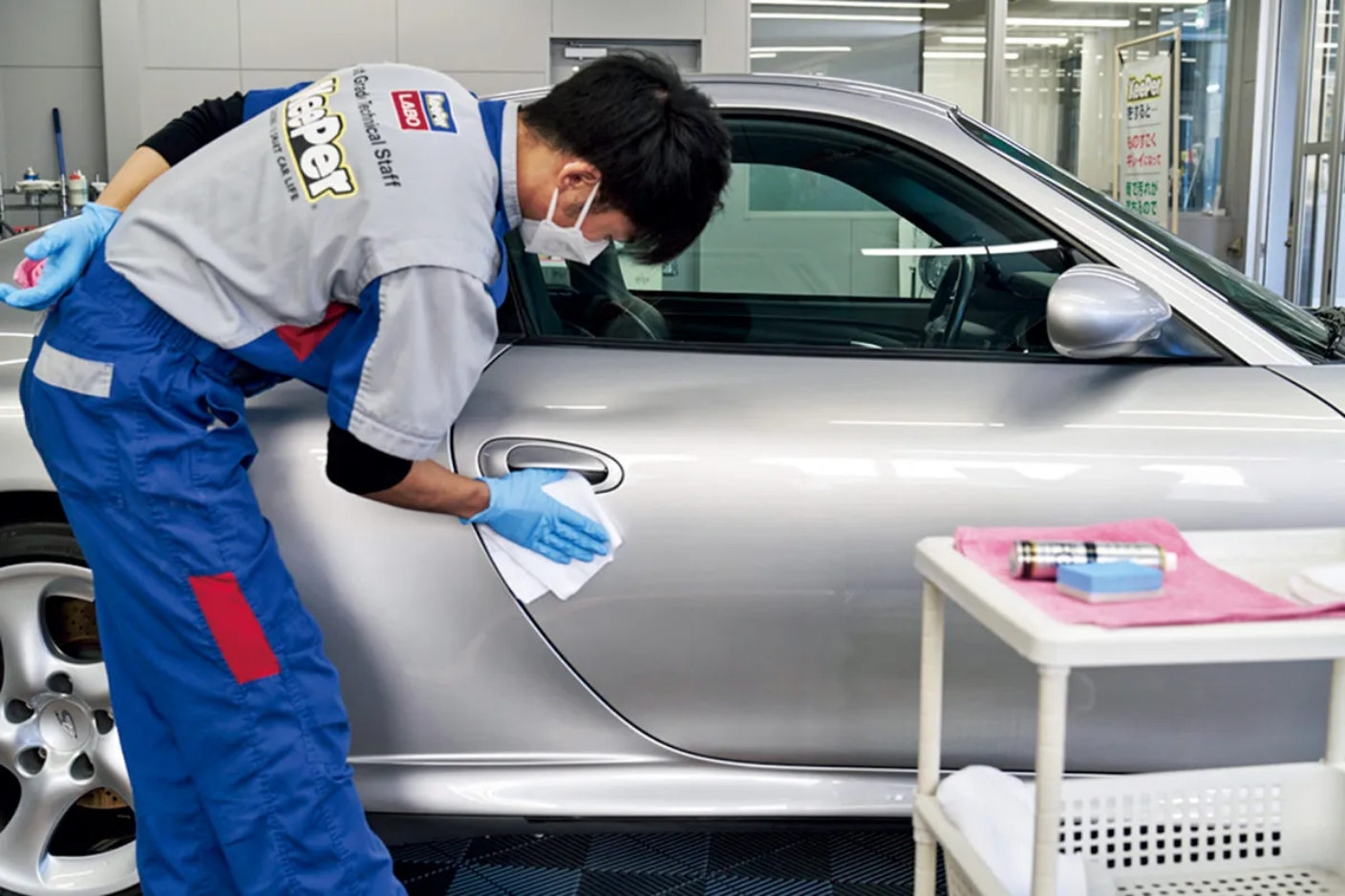 それでは、KeePerのコーティングとはどういうものなのか。たとえて言うならば、それは人間の肌を扱うのと同じなのだという。つまり、ボディを研磨するのは、肌に外科的な手術を施すのと同じだから、できうる限りしない。その代わり、まずは丁寧に汚れを落としたボディを基礎化粧品のようなガラス皮膜で覆って地肌を整え、その上に強力なレジン皮膜のコーティングを施していくことで、肌=塗装が本来持っている美しさや瑞々しさを、そのまま保てるようにしようというのである。
